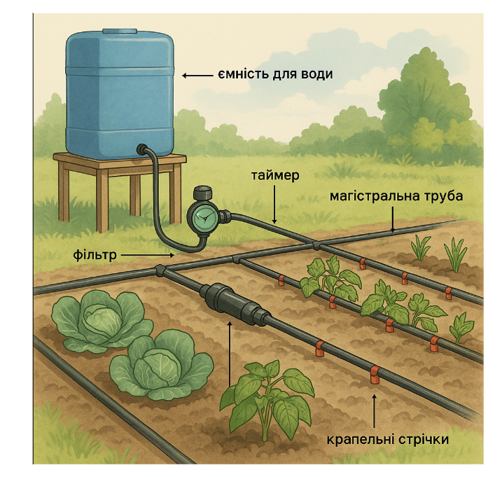 Потім підготуйте все необхідне для створення системи. Вам знадобиться ємність для води об’ємом 50-200 літрів, залежно від площі городу, магістральна труба діаметром 16-20 мм, крапельні трубки або стрічки з вбудованими крапельницями, а також з’єднувачі, трійники, заглушки та фітинги. Додайте до списку фільтр для очищення води від домішок, щоб система не засмічувалася, і, якщо хочете автоматизувати процес, придбайте таймер. Далі сплануйте розташування: поставте ємність на висоті 1-2 метри над землею для природного тиску, прокладіть магістральну трубу вздовж грядок і під’єднайте до неї крапельні стрічки так, щоб крапельниці опинилися біля основи кожної рослини.