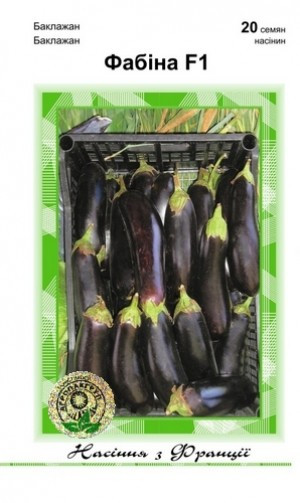 Фабіна F1 - ранній гібрид баклажана, вегетаційний період 70 днів. Рослина відкритого типу, висота 45-60 см. На рослині формується по 6-8 плодів одночасно. Плоди подовжено-циліндричні, насиченого темно-фіолетового кольору, в фазі технічної стиглості блискучі. Має красиву циліндричну форму, довжиною 20-23 см, діаметром 5-6 см. Шкірка тонка, м'якоть білувато-зелена, щільна, генетично без гіркоти. 6-8 плодів одночасно.