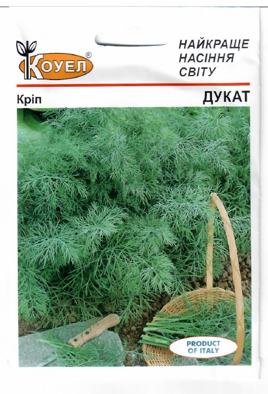 Дукат – середньостиглий сорт кущового кропу. Рослина гілляста, має гарну силу зростання. Листя насиченого інтенсивно - зеленого кольору, велике, соковите з сильним ароматом. Має високу стійкість до несприятливих погодних умов (зокрема до спеки), а також генетичну стійкість до грибкових захворювань. Витримує загущені посіви. Довго не втрачає товарних якостей. Зелень готова до збирання на 40 - 45 день після появи сходів. Рекомендується як для свіжого ринку, так і для консервації.